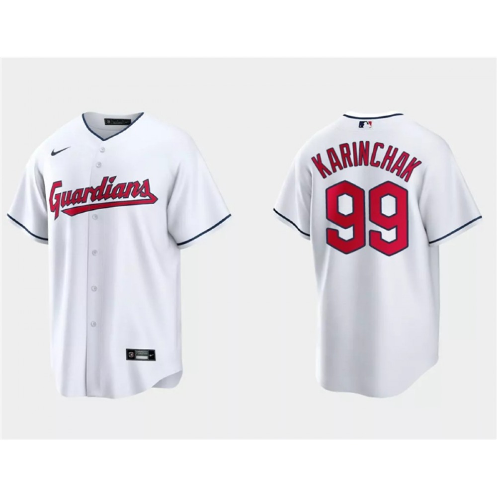 Men's Cleveland Guardians #99 James Karinchak White Cool Base Stitched Jersey