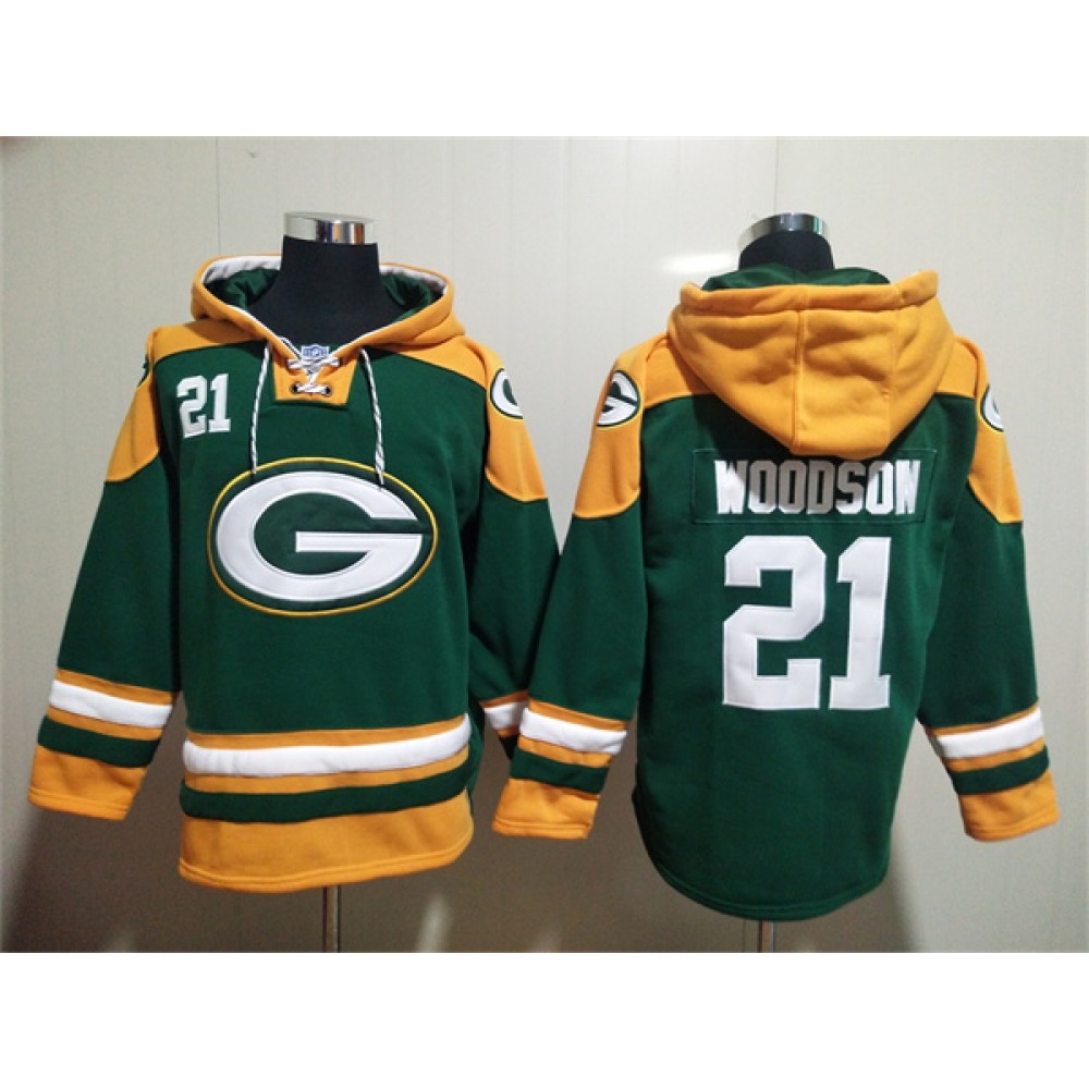 Men's Green Bay Packers #21 Charles Woodson Green Lace-Up Pullover Hoodie