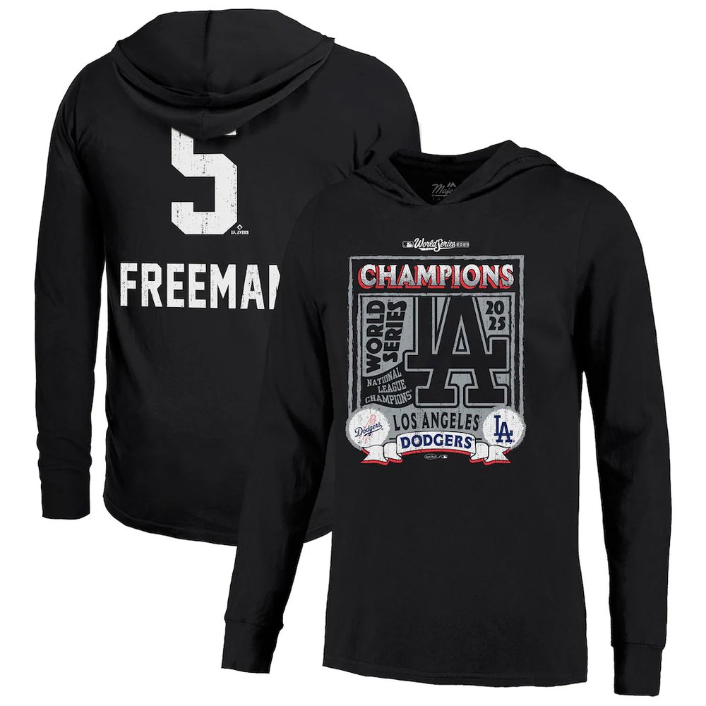 Men's Los Angeles Dodgers #5 Freddie Freeman Majestic Threads Black 2025 World Series Champions Name & Number Lightweight Hoodie