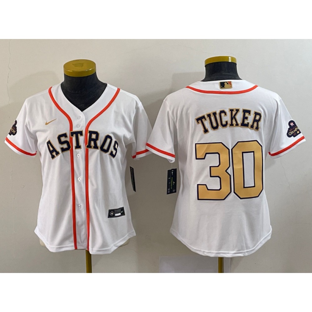 Women's Houston Astros #30 Kyle Tucker White 2023 Gold Collection With World Serise Champions Patch Stitched Jersey(Run Small)