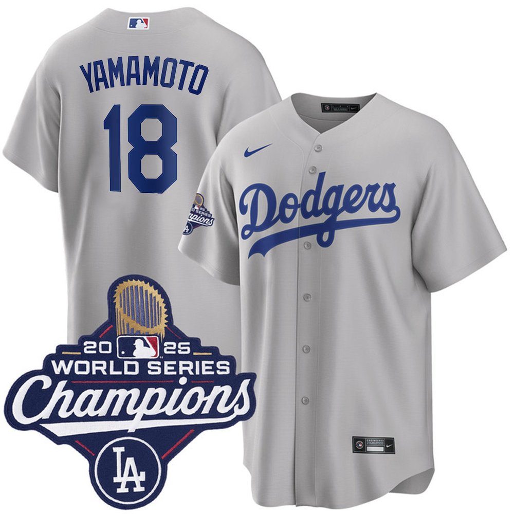 Youth Los Angeles Dodgers #18 Yoshinobu Yamamoto Nike Gray 2025 World Series Champions Home Replica Jersey